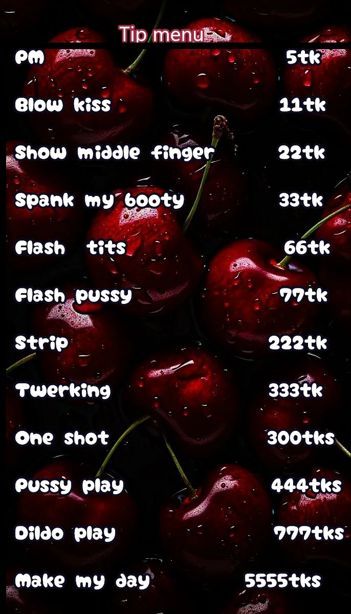 Ahegao, Exibicionismo, Mandar bater uma, Fumantes, Avaliação de pintos, Topless, Fetiche por pés, Capô de fusca, Amante, Punheta, Chuveiro, Gozada na cara, Gozando dentro, Cosplay, Masturbação, Boquete, Pegging, Espiadinha por baixo, Cavalgada, Posição 69, Brinquedos sexuais, Dança erótica, Show com óleo, Humilhação, Rebolando, Striptease, Sentada na cara, Atuação, Orgasmo, Penetração com dedos, Hardcore, Linguagem explícita, Dildo ou vibrador